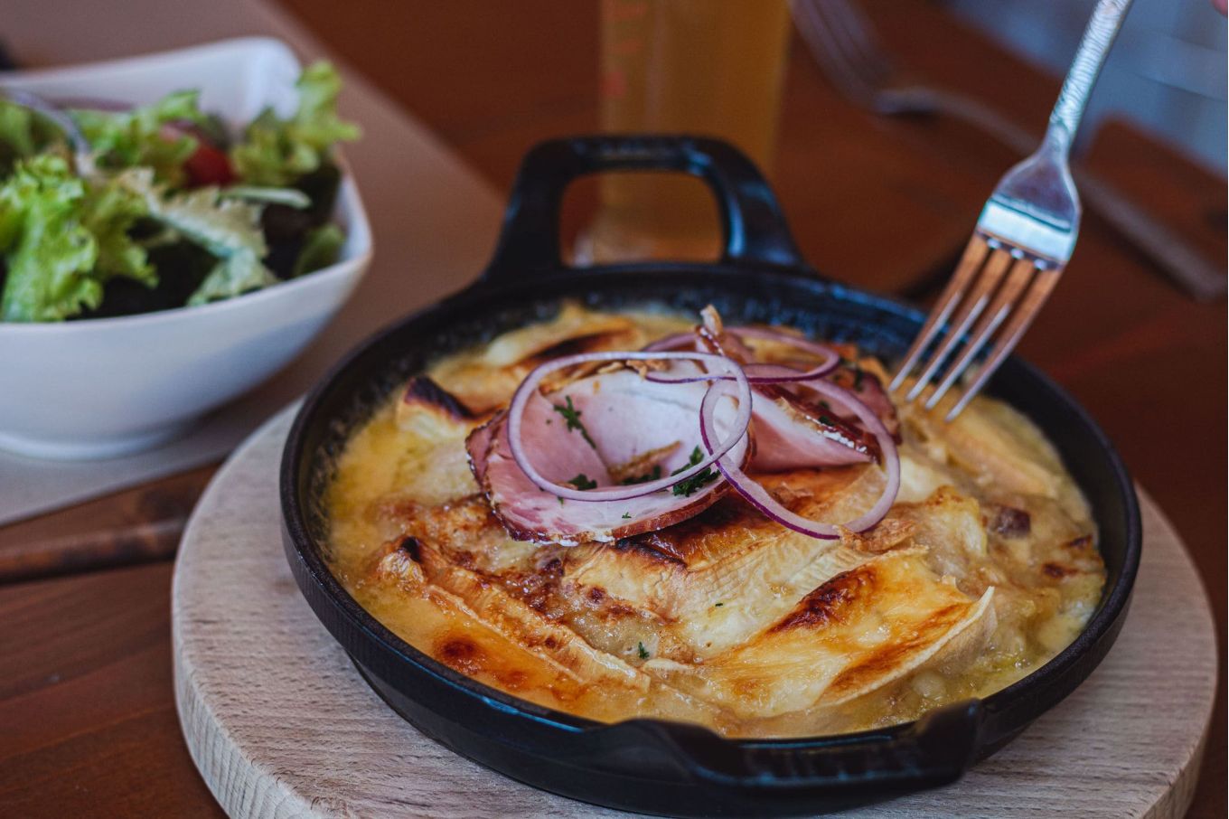 17.50 €Knepfla aux lardons, à la crème fraîche et fromages -